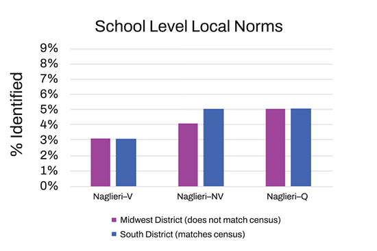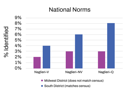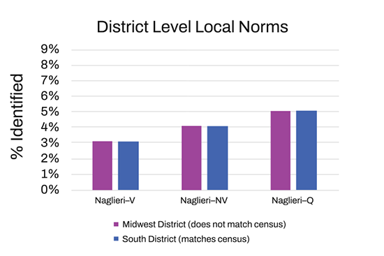 Figure 1 shows the percentage of students identified as gifted within each school district, comparing age-based normative scores (coming soon) at a national, district-level, and school-level with a 95th percentile cutoff using only one Naglieri General Ability Test at a time.