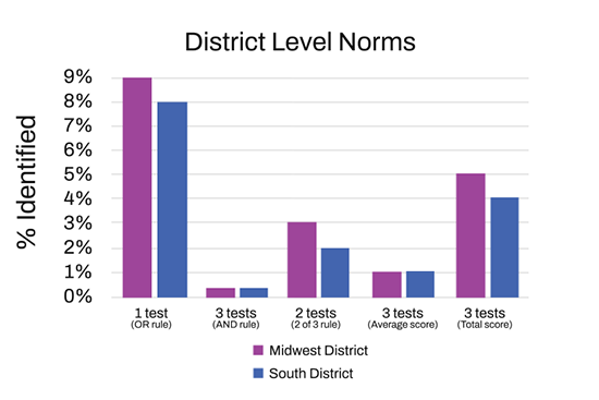 District-level norms typically offer larger samples and greater year-to-year stability, which can simplify implementation and messaging. However, this level of norming may be less sensitive to students who stand out within their individual schools.