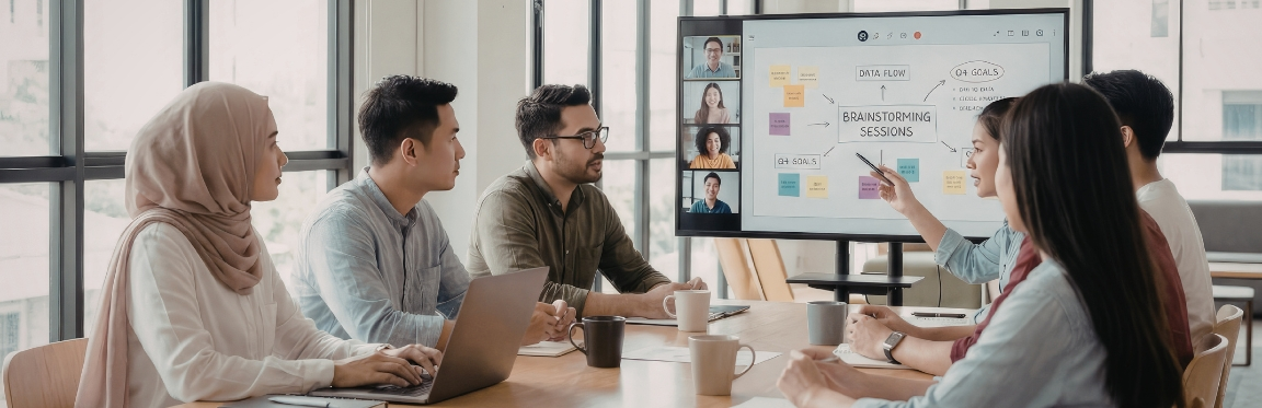 A group of professionals sit in a meeting. One person leads the conversation and the others listen.