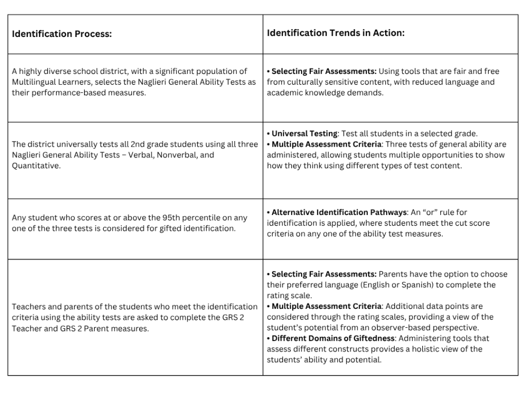 There is a growing momentum towards selecting fair assessments for the identification of gifted students. Implementing this trend into practice involves selecting assessments that are developed with features that can fairly assess demographic groups that have historically been overlooked, such as students from diverse racial, ethnic, linguistic, or socioeconomic backgrounds², ³.