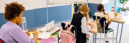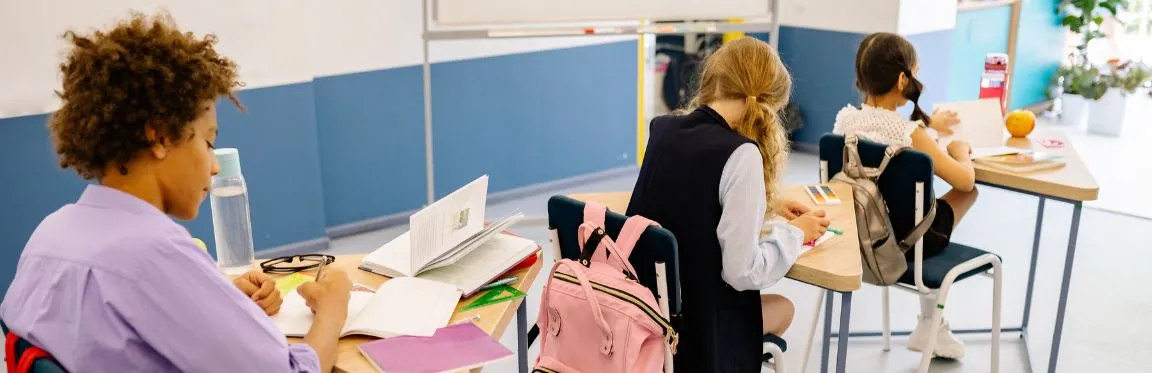Two young girls sit at their desk in a classroom with their masks on. They concentrate on their work.